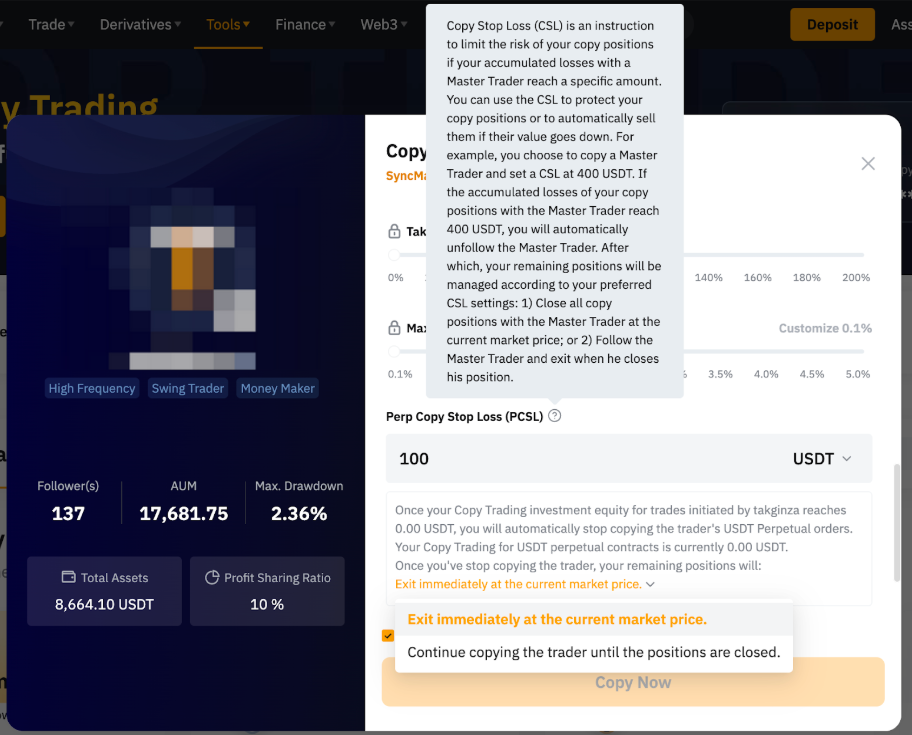 Trailing Stop is only supported for USDT perpetual trades in Copy Trading. When you set up a Trailing Stop after you have copied a Master Trader, any existing copied bot will be automatically terminated at the market price.