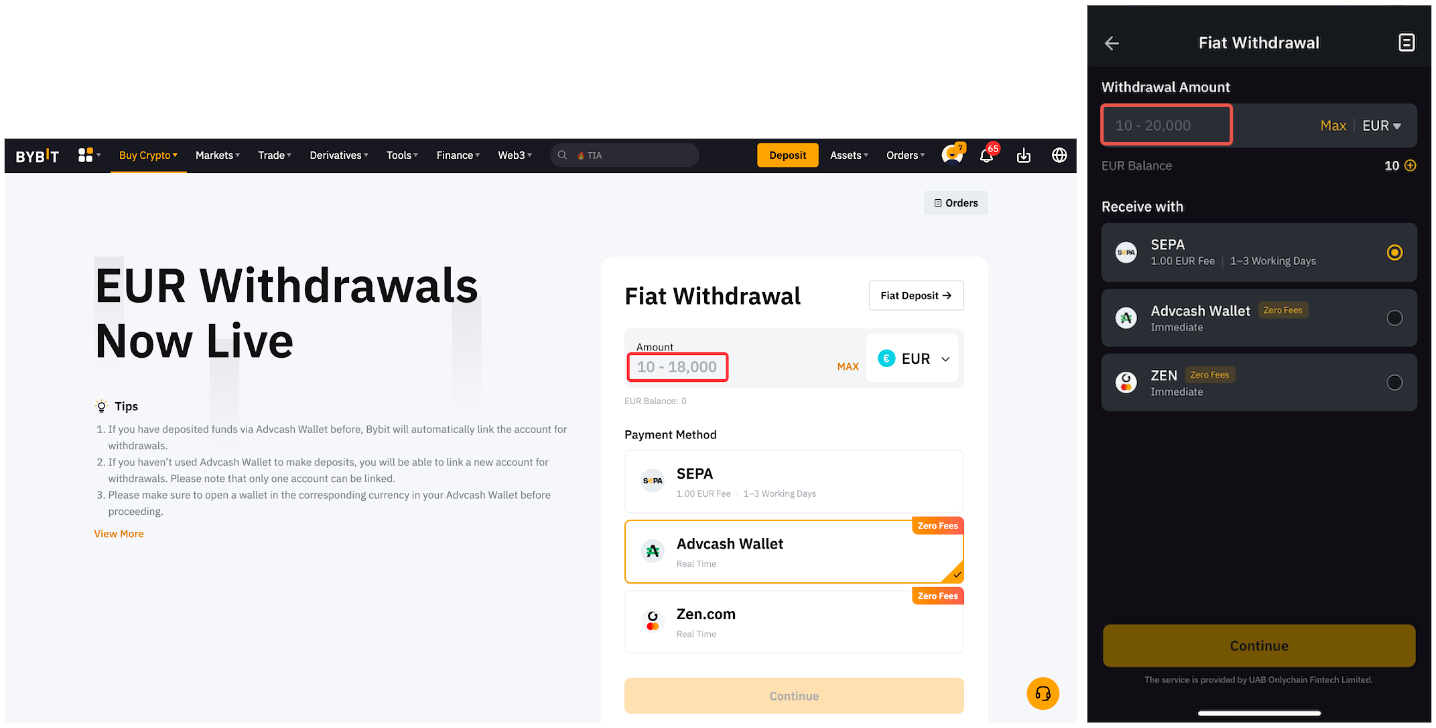 The minimum and maximum withdrawal amounts per transaction are indicated in the order zone.