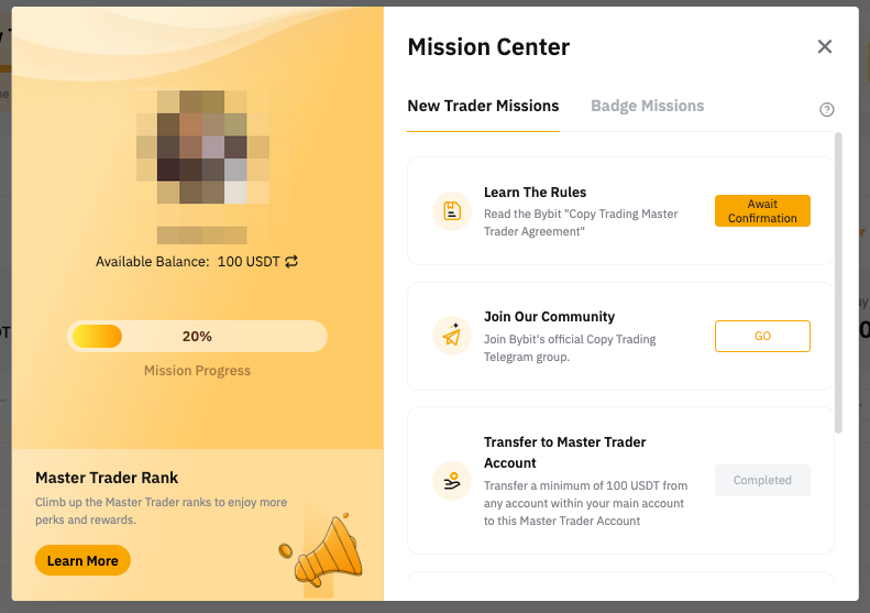 Master Traders are required to first complete their NewTraders mission to be eligible for ranking and listing on the Bybit Copy Trading Recommended Page. Master Traders can rank in different categories through a two-stage evaluation process that our system uses to feature profiles on the leaderboard on the Copy Trading homepage. These stages are: