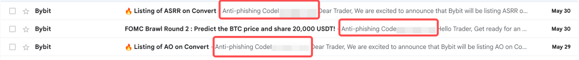 Bybit’s Anti-Phishing Code is a security feature comprising a unique set of alphanumeric and special characters. Once activated, this personalized code would appear in all official Bybit emails and text messages thereafter, allowing users to easily verify the authenticity of information they receive.