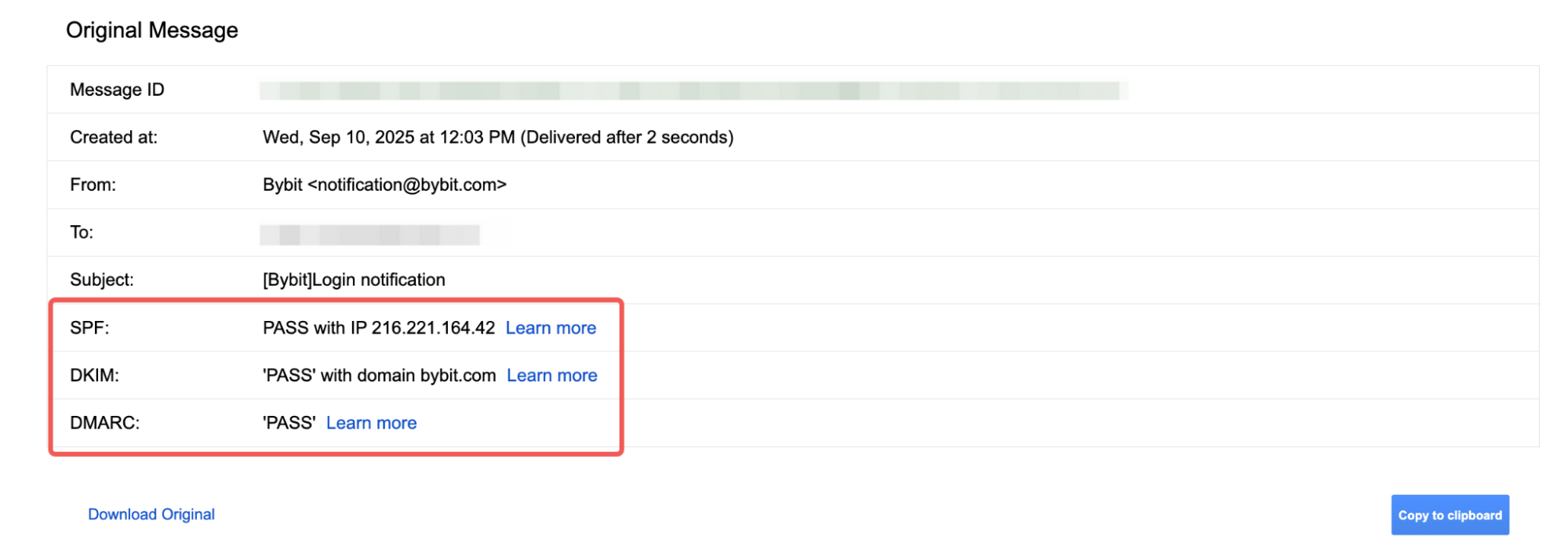 As mentioned above, even if the verification result is official, the sender’s contact information can be easily forged using spoofing techniques. Below is a typical example demonstrating how scammers conceal and forge sender email addresses to solicit assets from Bybit users.