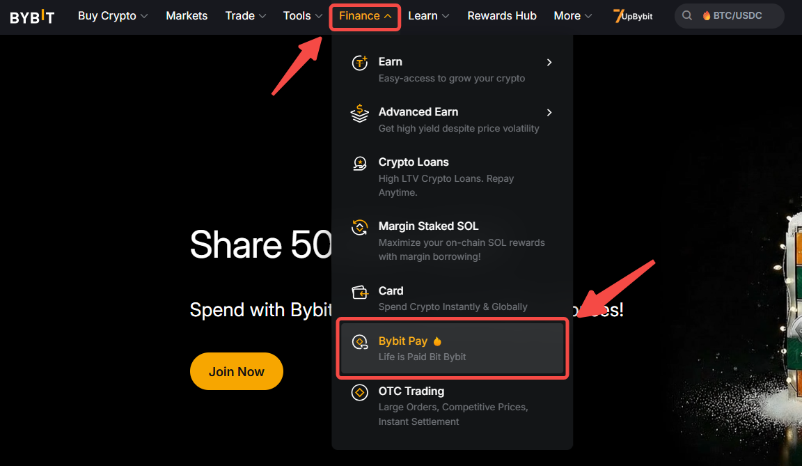 Step 1: From the Bybit homepage, click on Finance → Bybit Pay at the navigation bar to enter the Bybit Pay page. Then, click on the Send button.