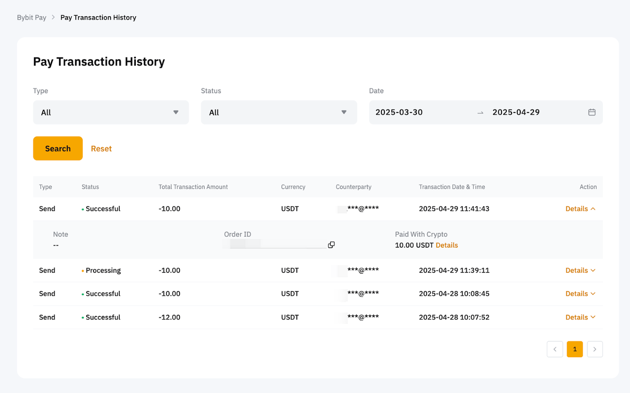 To view your payment history, please head to the Bybit Pay page, scroll to the bottom, and click View All. Alternatively, simply go to Pay Transaction History.