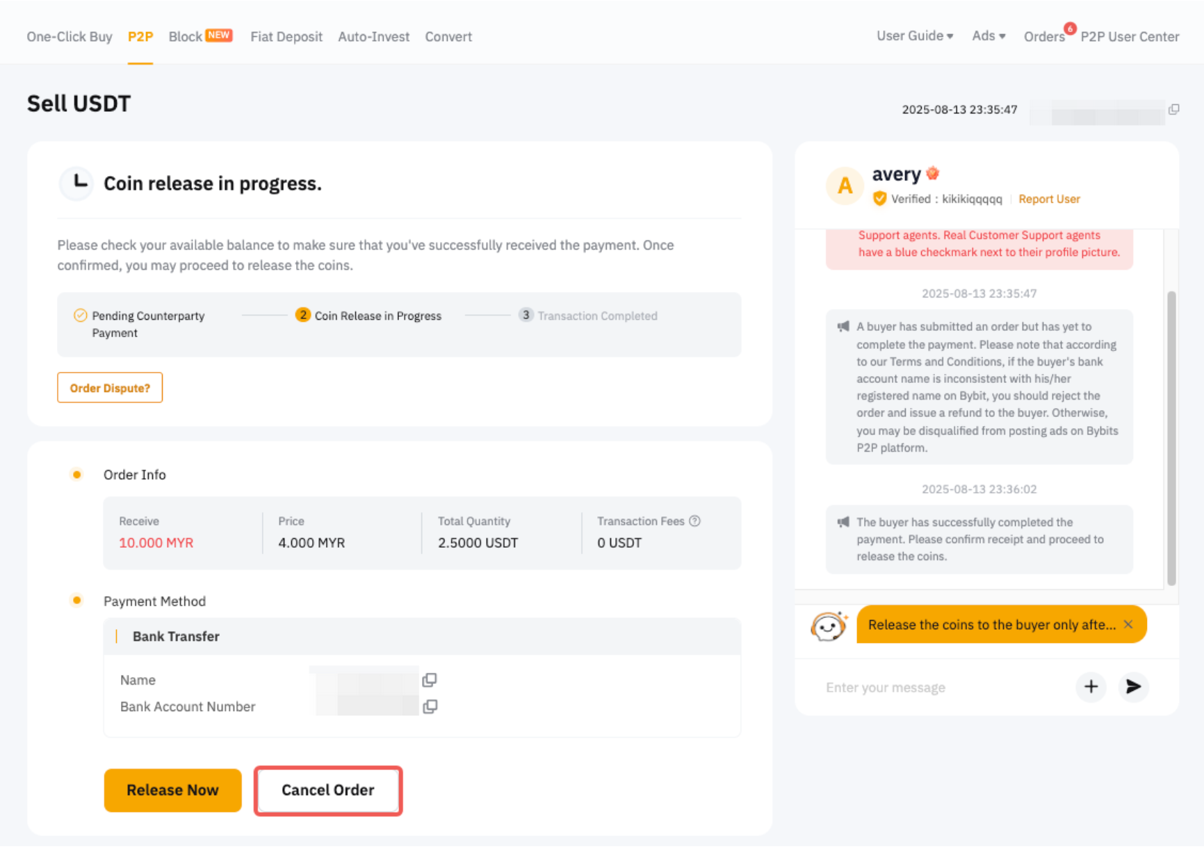— Your bank account name must be consistent with your registered name on Bybit. Otherwise, your account might be suspended and the buyer has a right to refuse to purchase the coin with you.
