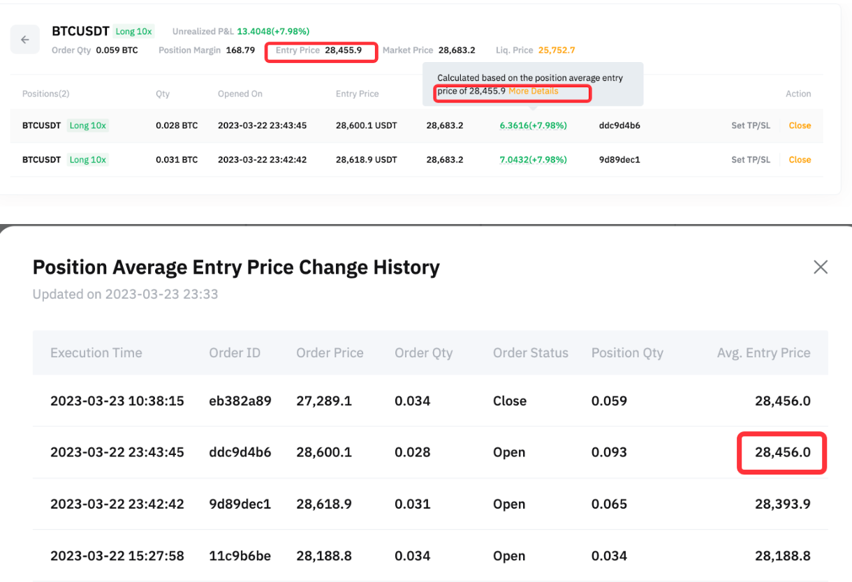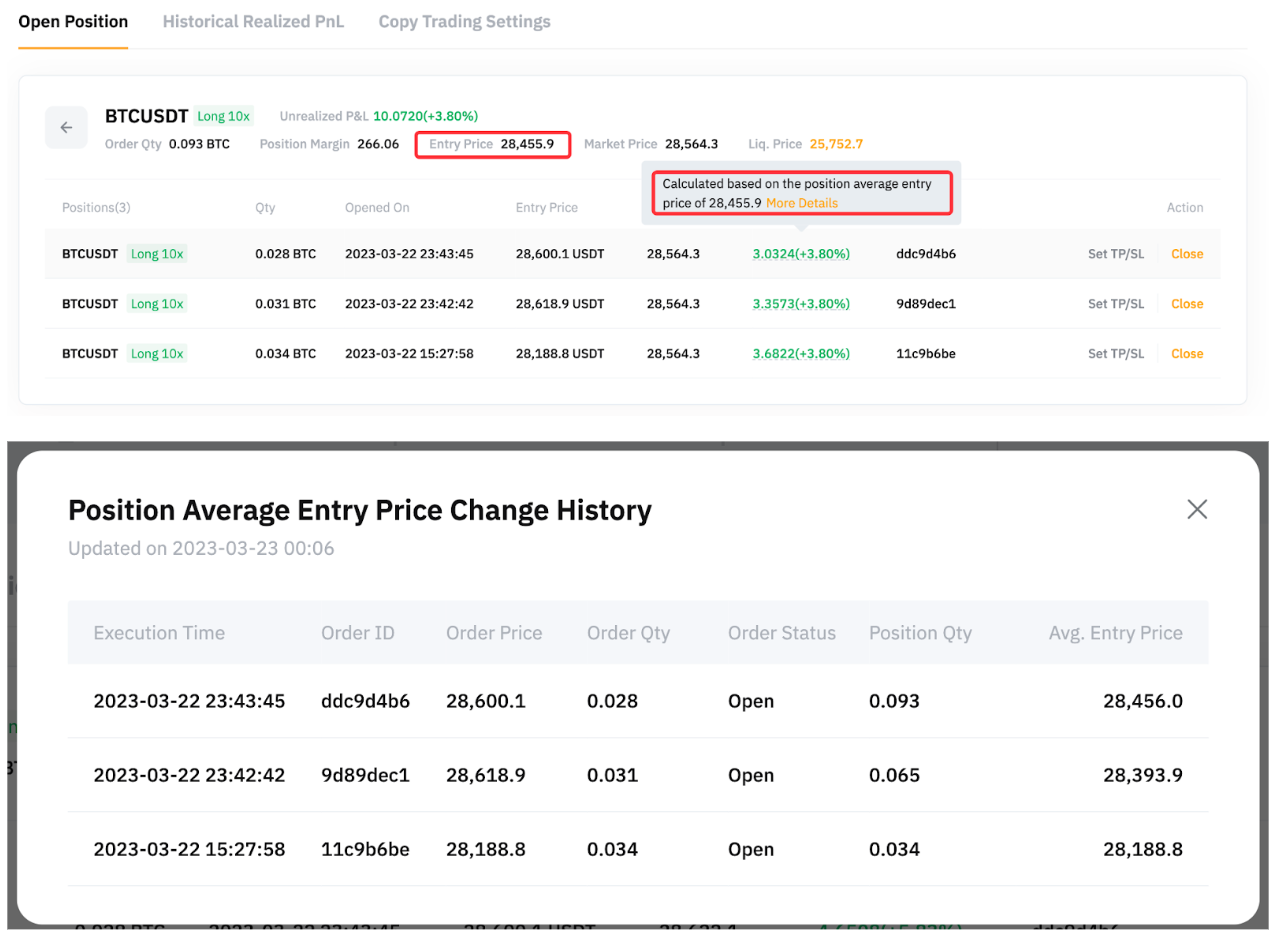 Desde la pestaña Posición Abierta, puede ver que el precio de entrada promedio de la posición es en realidad 28,455.90 USDT y este será el precio base utilizado para calcular las PyG no realizadas o cerradas. El seguidor A puede pasar el cursor sobre el PyG no realizadas y hacer clic en Más detalles para ver el historial de cambio de precio de entrada promedio de la posición.