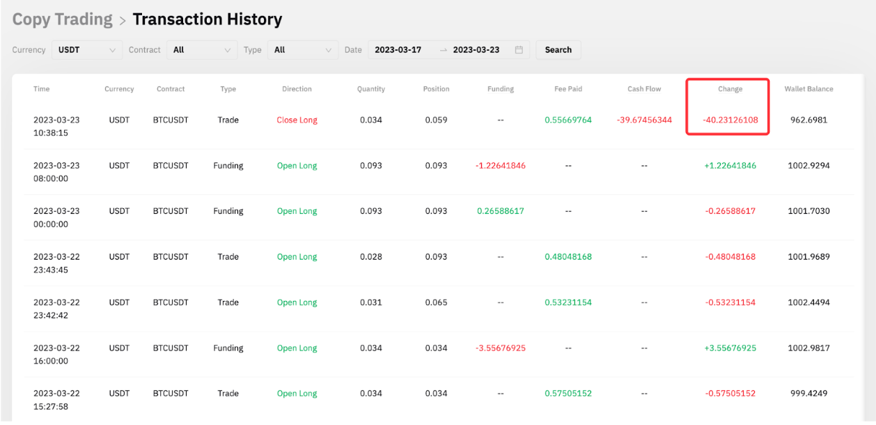 Master Trader B ha cerrado parcialmente la posición, al igual que la posición del Seguidor A. El Seguidor A puede ver que se ha deducido un total de -40.23126108 USDT del saldo de su billetera, que incluye la pérdida de posición de -39.67456344 USDT por orden larga de 0.034 BTCUSDT y también una tarifa de trading de 0.55669764 USDT para cerrar esa orden.