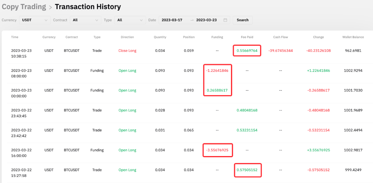 A las 16:00 UTC, la posición no se cierra y se incurrirá en la tarifa de financiación. A partir de la captura de pantalla a continuación, podemos determinar que la tasa de financiación es negativa y, por lo tanto, el seguidor A recibió la tarifa de financiación por su posición larga. Se han agregado 3.55676925 USDT a su saldo disponible para este Master Trader.