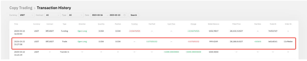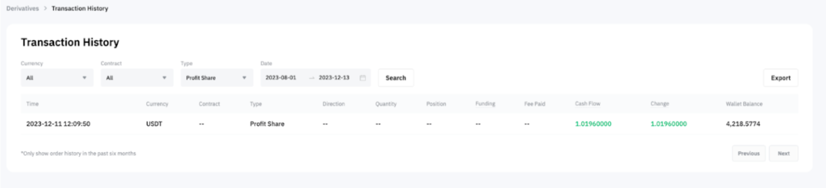 — Como Master Trader, puedes ver tu registro de reparto de ganancias en el Historial de cuenta de derivados o en el Registro de transacciones de la cuenta de trading unificada (para Master Trader actualizado a UTA).