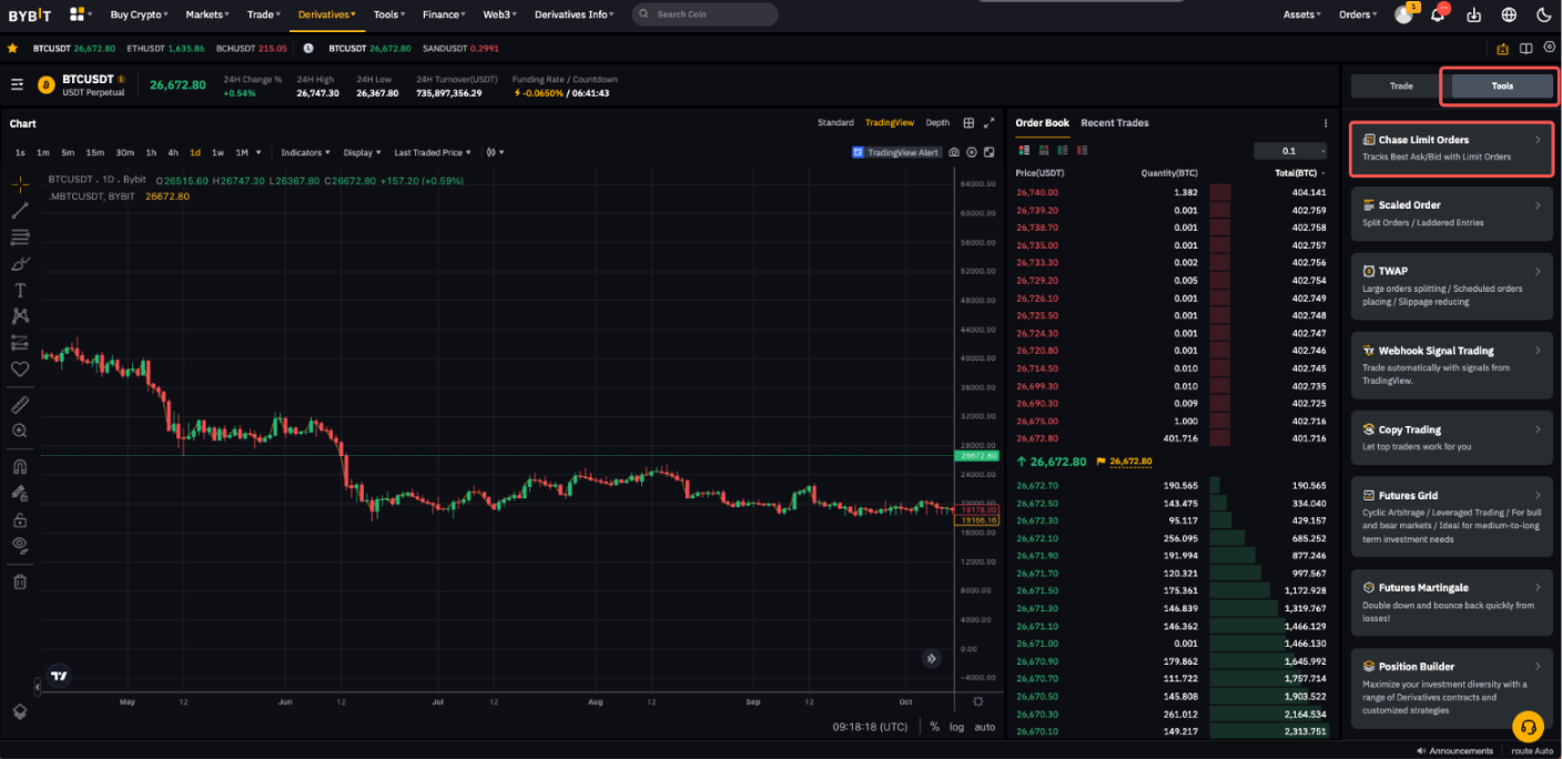 Paso 3: En el sitio web de Bybit, haz clic en la pestaña Herramientas y selecciona Órdenes límite de seguimiento.