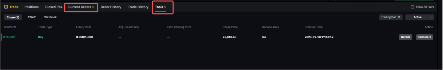 Una vez enviada la orden límite de seguimiento, podrás ver la orden límite de seguimiento en las pestañas Órdenes actuales y Herramientas.