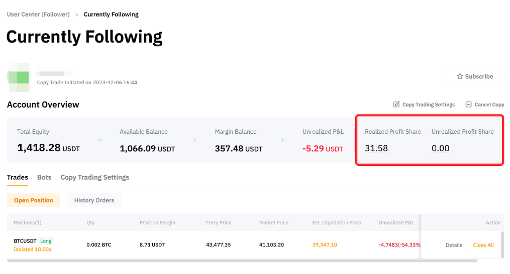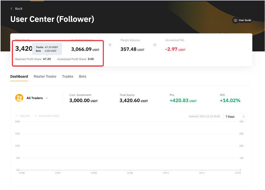 Dirígete al Centro de usuarios (seguidor) y podrás ver tu Reparto de ganancias realizadas y no realizadas en posiciones de USDT perpetuos y trading bots.