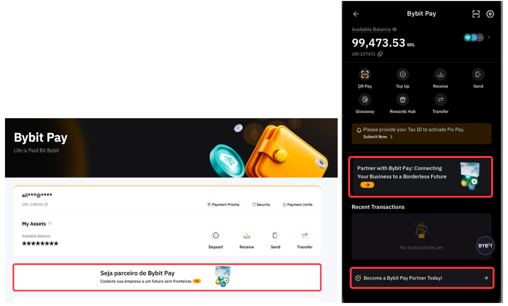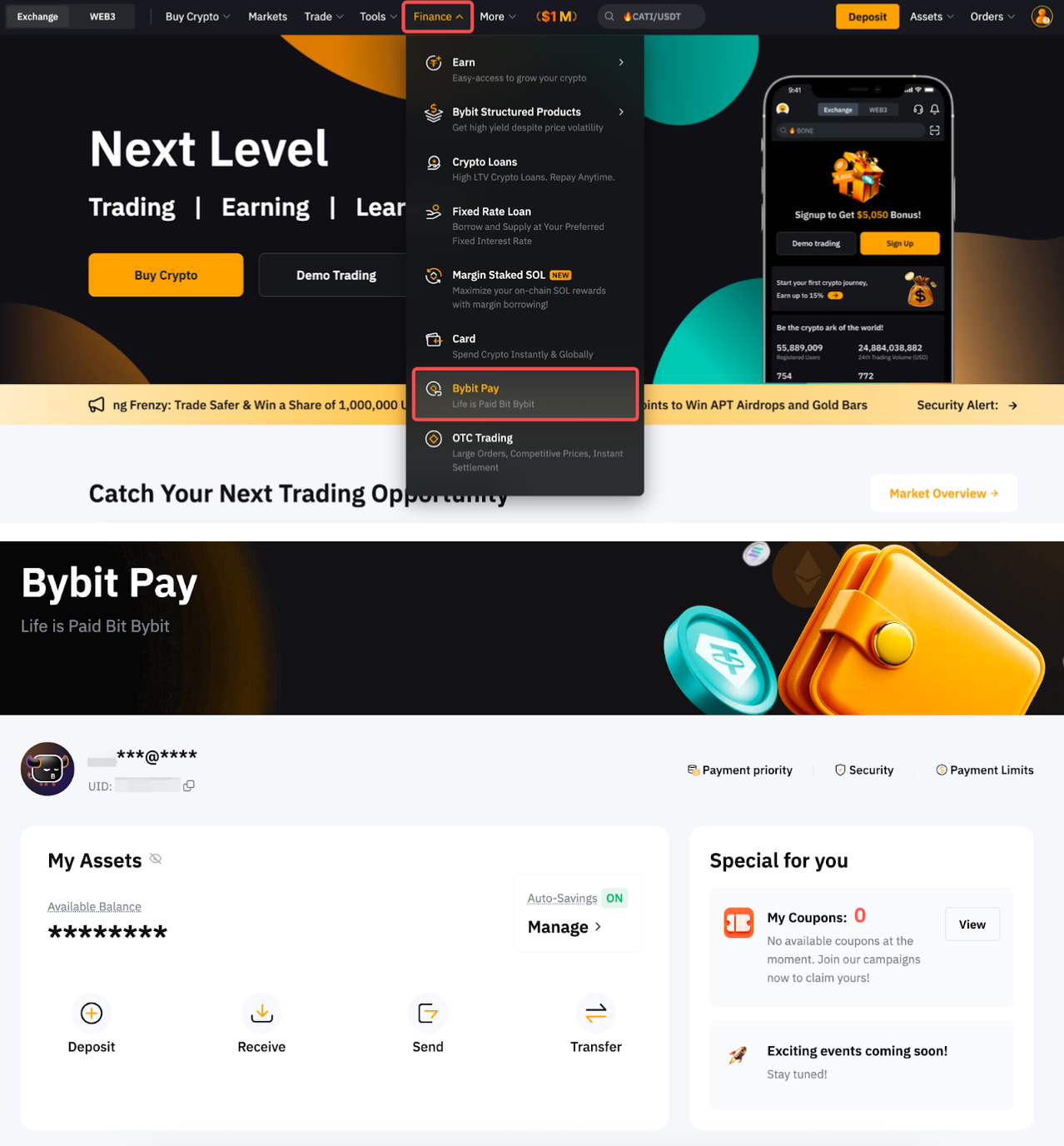 Si estás en el sitio web de Bybit, haz clic en Finanzas y toca Bybit Pay.