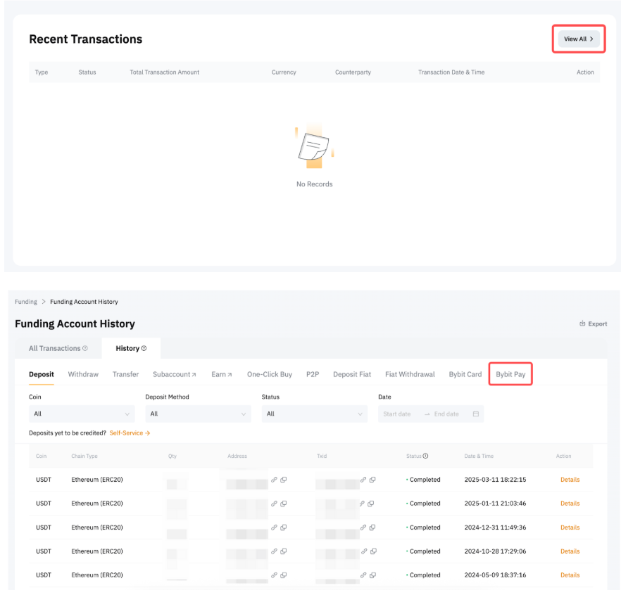 En el sitio web, ve a la página de Bybit Pay, desplázate hacia abajo hasta la parte inferior para encontrar las transacciones recientes y haz clic en Ver todo. También puedes encontrar el historial de transacciones en la cuenta de fondos →Historial → Bybit Pay.
