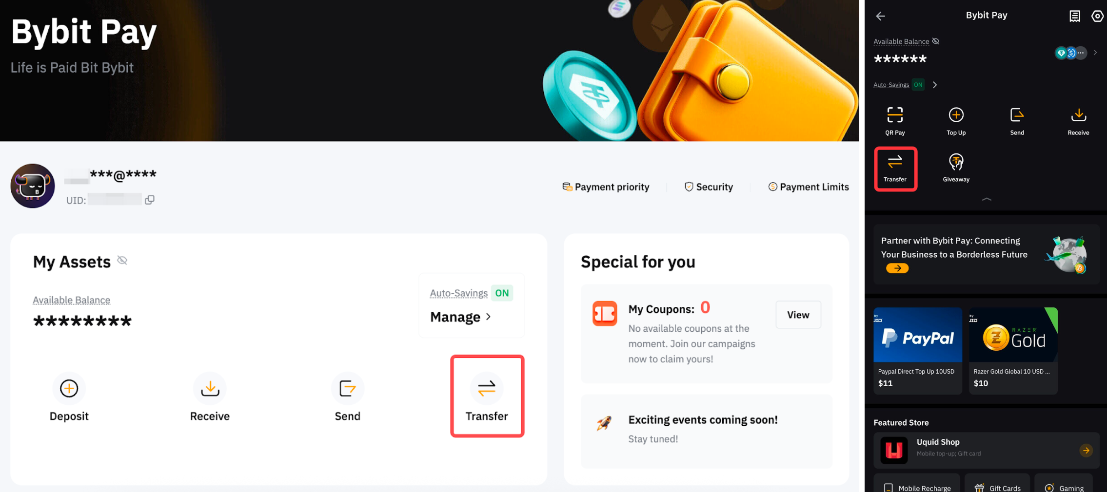 • Enviar y recibir pagos de otros usuarios y comerciantes de Bybit Pay mediante transferencia interna utilizando los detalles de su cuenta o códigos QR.