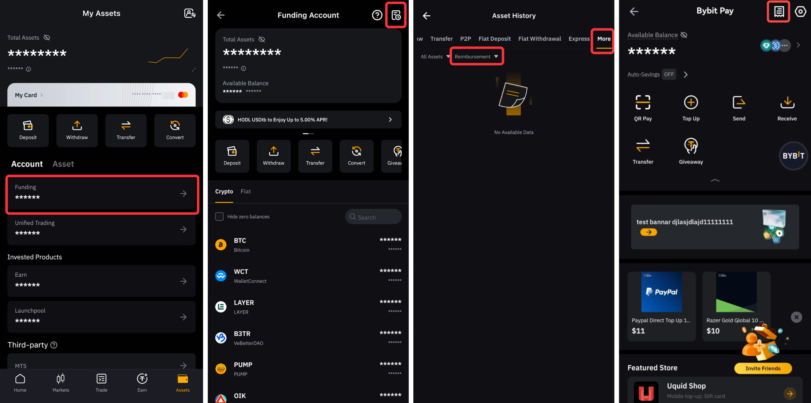 En la aplicación, ve a Activos → Cuenta de fondos → Más, luego filtra el tipo a Bybit Pay. También puedes ir a la página de Bybit Pay y pulsar el icono de papel en la esquina superior derecha.