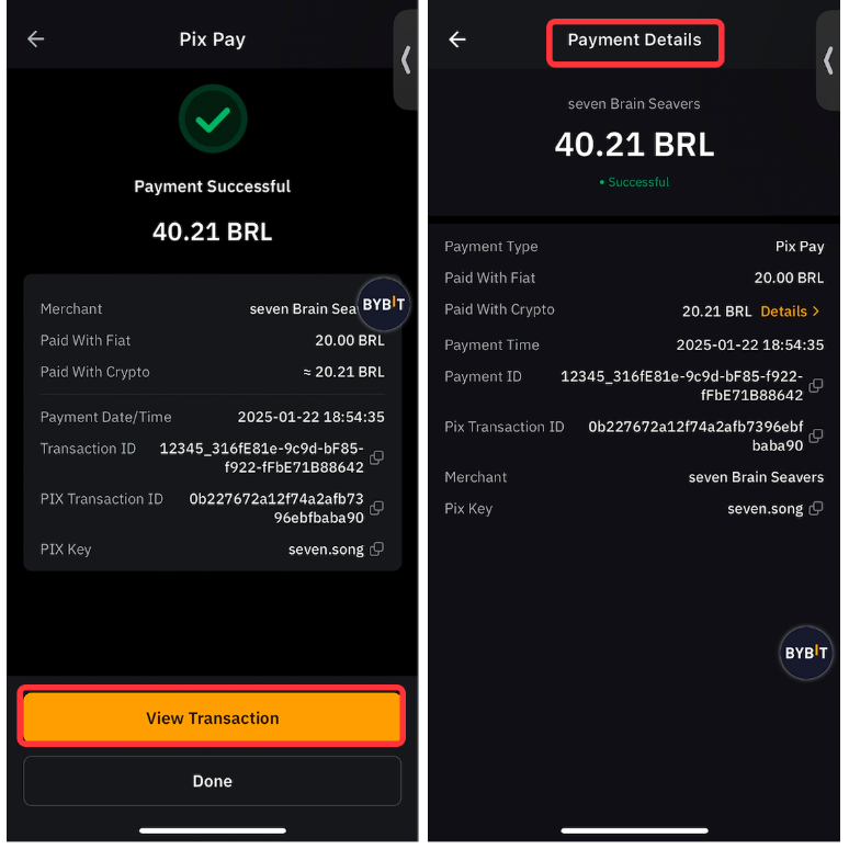 Todo el historial de transacciones, incluido PIX Pay con una Bybit Card y Bybit Pay, se registrará en el historial de transacciones de Bybit Pay.