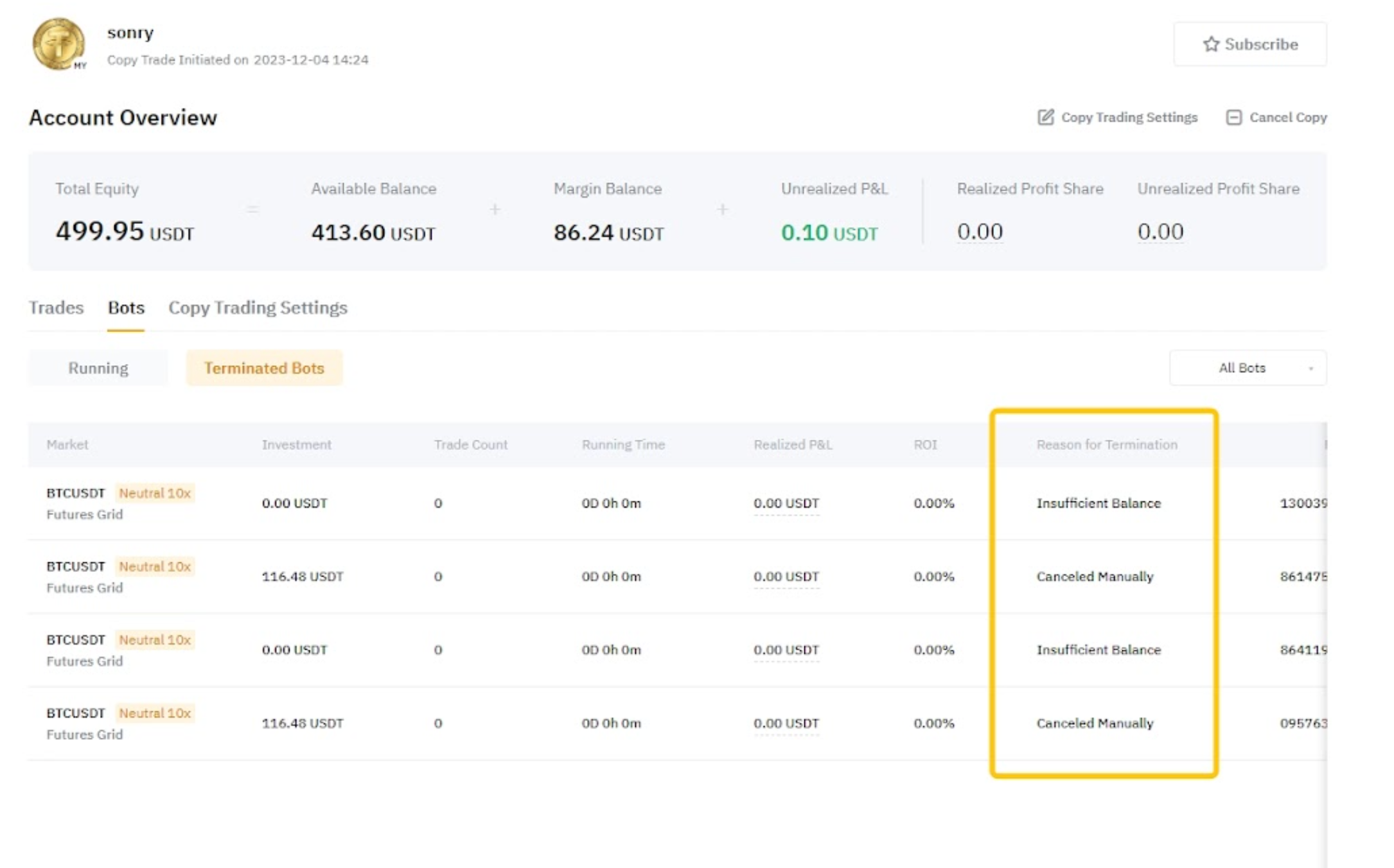 Esto se debe a que los bots de trading copiados están asociados a Copy Trading y sólo se puede acceder a ellos a través del Centro de Usuario (Seguidor). Los Bots de Trading creados por uno mismo, por otro lado, se mostrarán bajo la entrada principal del Bot de Trading. Para obtener más información, consulte Cómo empezar a utilizar Copy Trading (Seguidor).