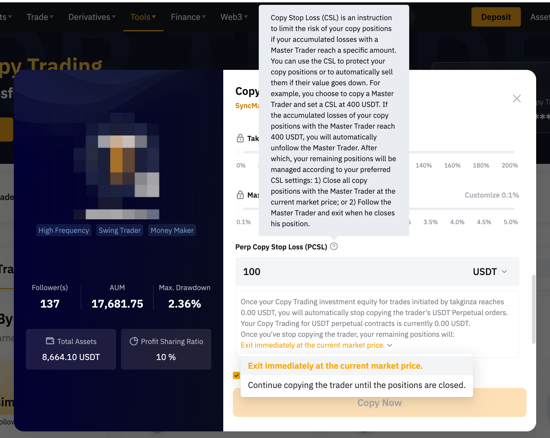 Tenga en cuenta que el PCSL (Copia Stop Loss Perpetuo) sólo medirá el total en tiempo real de la PNL (Pérdidas y Ganancias) realizada + la PNL no realizada procedentes de operaciones con USDT Perpetual como criterio para activar el PCSL. Los cambios en el capital resultantes de la participación en beneficios y Trading bot no se incluirán en el cálculo. Por lo tanto, cuando se activa la PCSL, los inversores pueden recuperar un importe inferior al nivel de capital estimado que aparece en la interfaz de usuario.