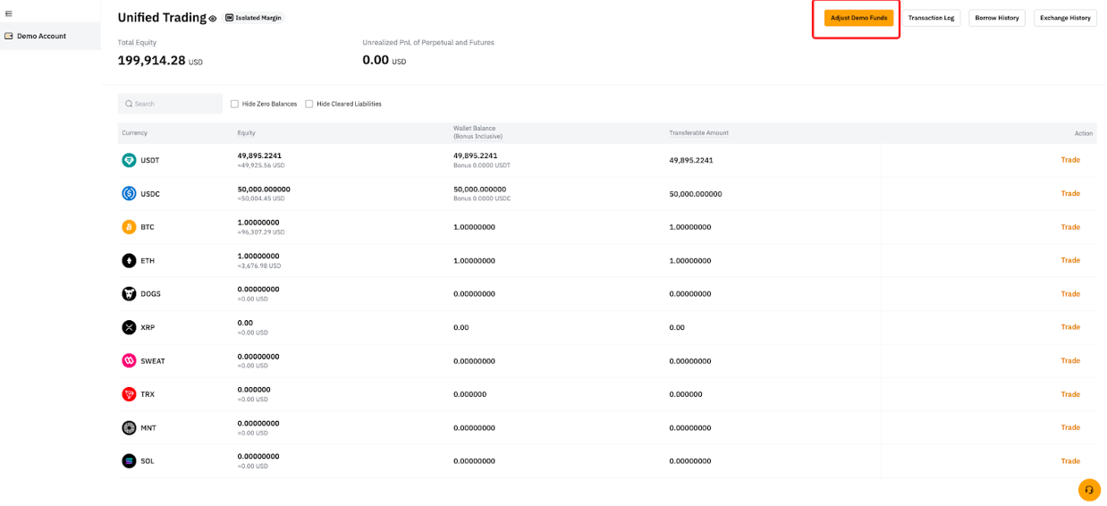 Actualmente, Trading de Prueba es compatible con Cuenta de trading unificada. Esto permite a los traders hacer trading simulado con Spot y Derivados en la Cuenta de trading unificada.
