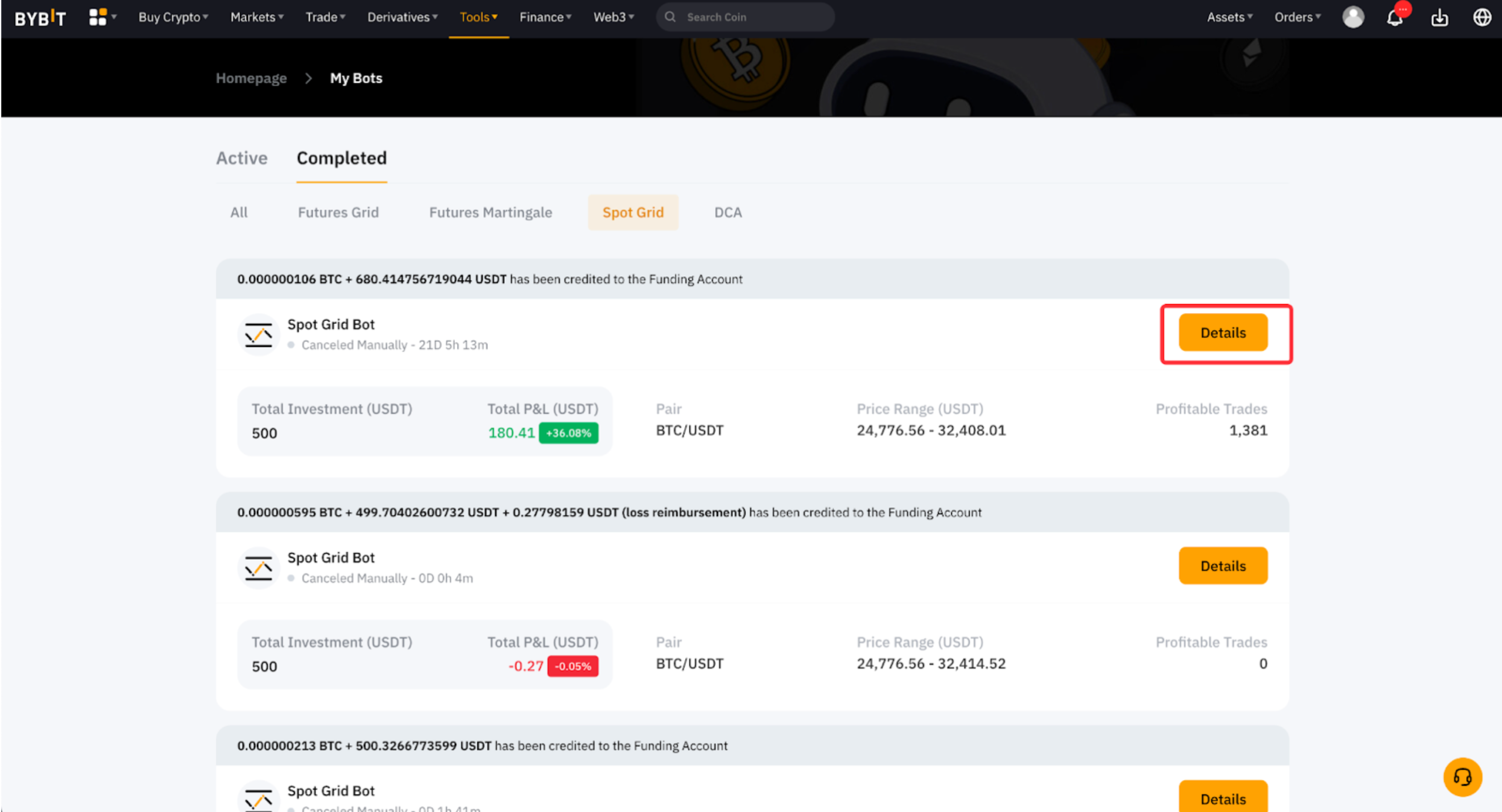Dirígete a Mis bots de redes para ver todas las transacciones activas y completadas. Haz clic en Detalles para ver los detalles de tu trade, incluidas las ganancias, la APR total y el rango de precios.