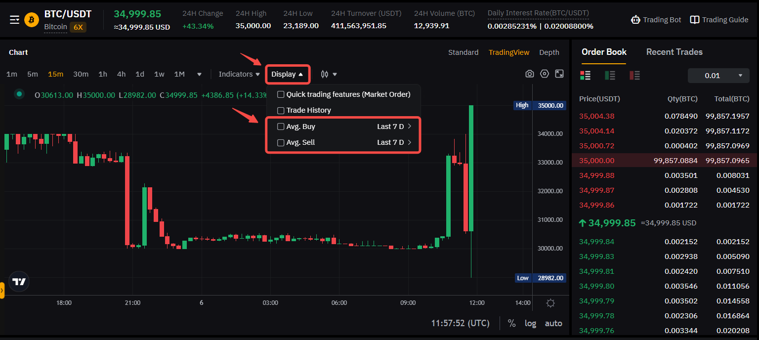 Cuando se opera en Spot, puede ver el precio promedio de sus órdenes de compra y venta directamente en el gráfico de trading. Para activarlo, haga clic en Mostrar y marque el precio promedio que desea ver. También puede seleccionar el periodo sobre el que se calculará la cotización media (últimos 7, 30, 60 ó 90 días). Tenga en cuenta que el precio promedio se calculará desde el día actual hasta el último día del periodo seleccionado.
