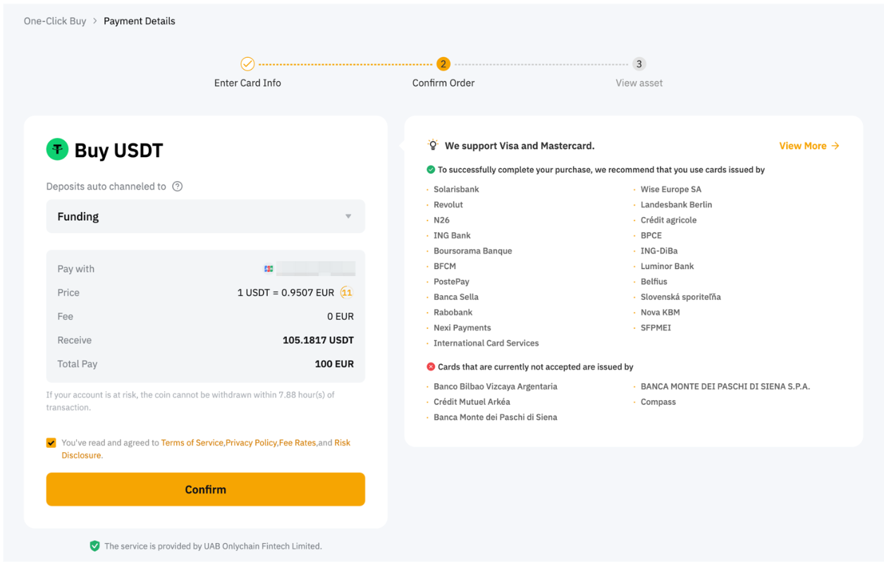 Paso 4: Ingresa y verifica los detalles de la compra y presione Confirmar para procesar tu orden. Toma nota que el precio de referencia se actualizará cada 30 segundos.