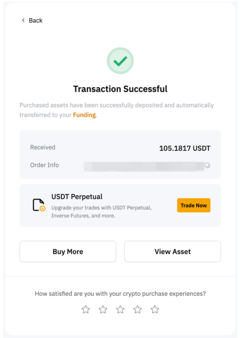Paso 6: La transacción se ha completado. Las monedas serán acreditadas en tu cuenta inmediatamente cuando la orden haya sido completada.