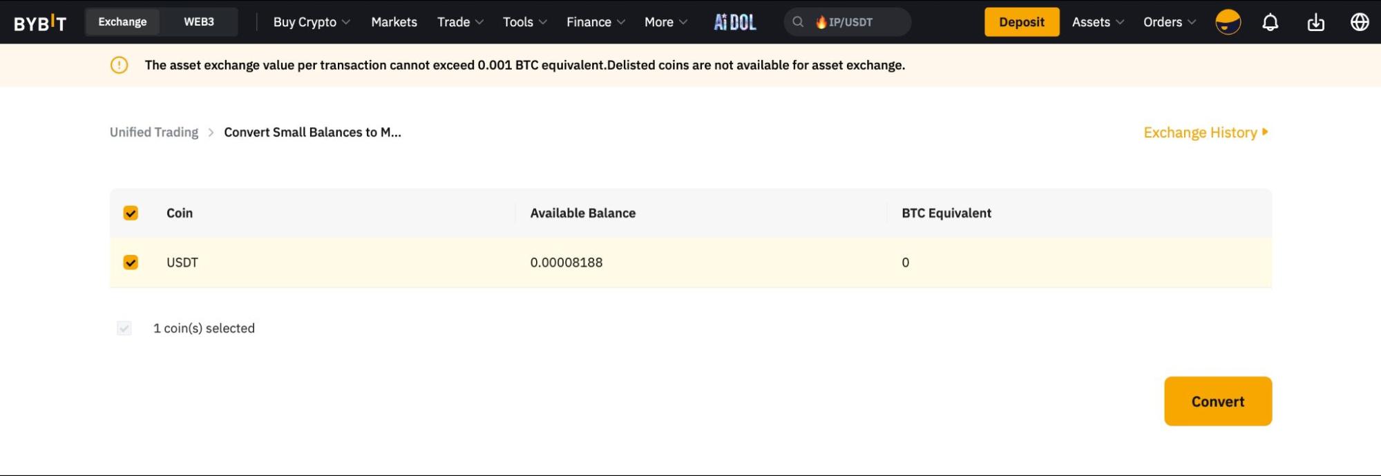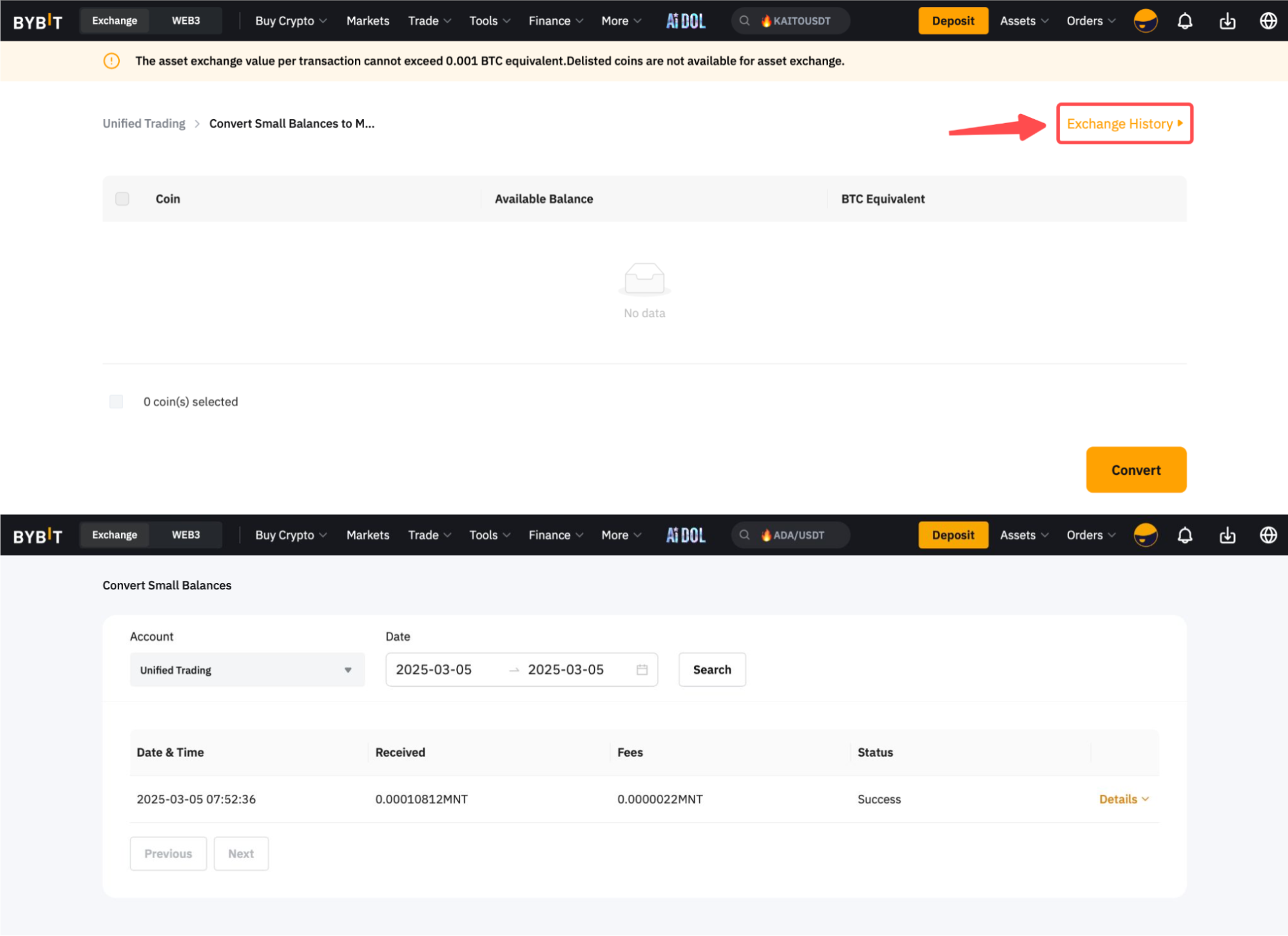 Para mejorar la utilización de los activos pequeños en su cuenta de Bybit, puede convertir cualquier activo con un valor inferior a 0,001 BTC o equivalente en MNT en una sola conversión siguiendo cuatro sencillos pasos. Para realizar la conversión de saldos pequeños a MNT, los usuarios de la Cuenta de Operaciones Unificada (UTA) necesitan transferir sus fondos a su UTA. Tenga en cuenta que puede realizar una conversión de saldos pequeños cada seis horas.