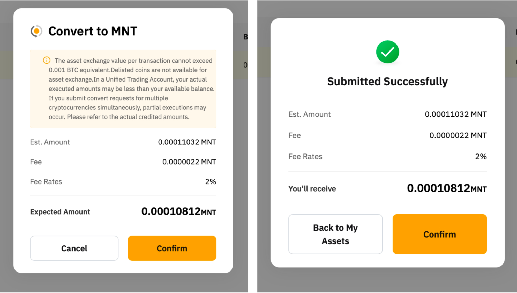 — El valor de intercambio de activos de cada transacción no puede superar el valor equivalente a 0.001 BTC y no puede ser inferior al equivalente a 0.00000001 MNT.