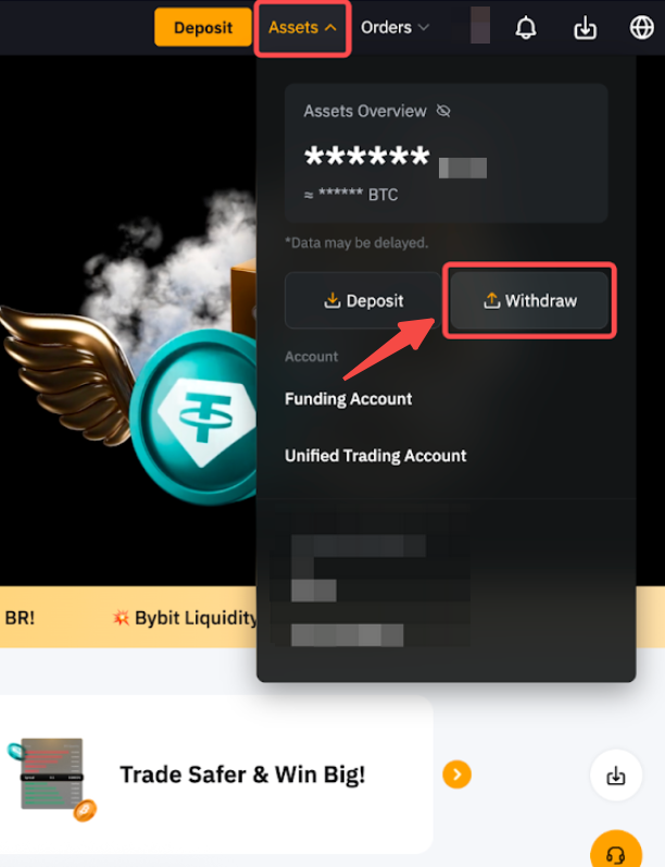 Paso 1: Desplace el cursor sobre Activos en la esquina superior derecha de la página Bybit y, a continuación, seleccione Retirar.