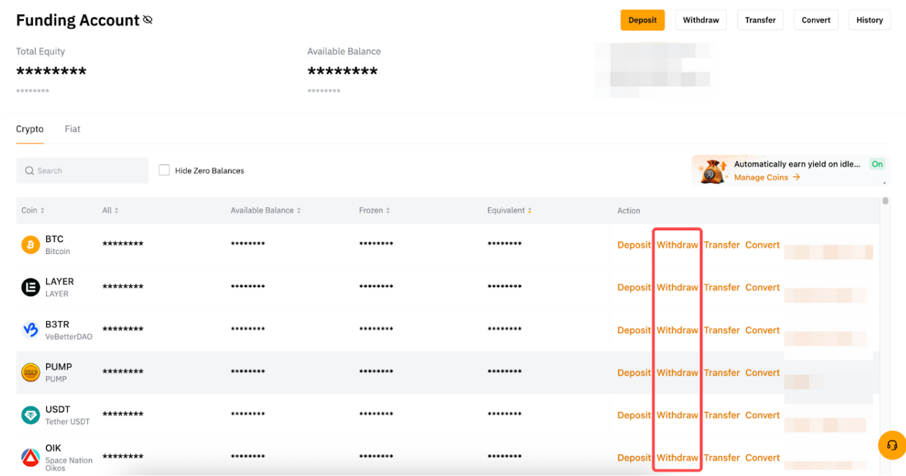 También puedes ir a la página de tu cuenta de fondos y hacer clic en Retirar debajo de la moneda que deseas retirar.