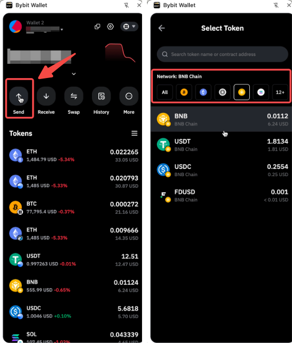 Paso 3: Haz clic en Enviar y pega la dirección de tu billetera en el cuadro de entrada. Asegúrate de elegir BSC, de lo contrario, es posible que tus USDT y BNB no se transfieran correctamente.