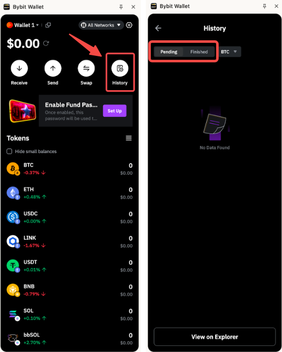 Haz clic en Historial en tu portal Bybit Wallet para ver tu historial de depósitos y retiros en las pestañas Pendiente y Finalizado.