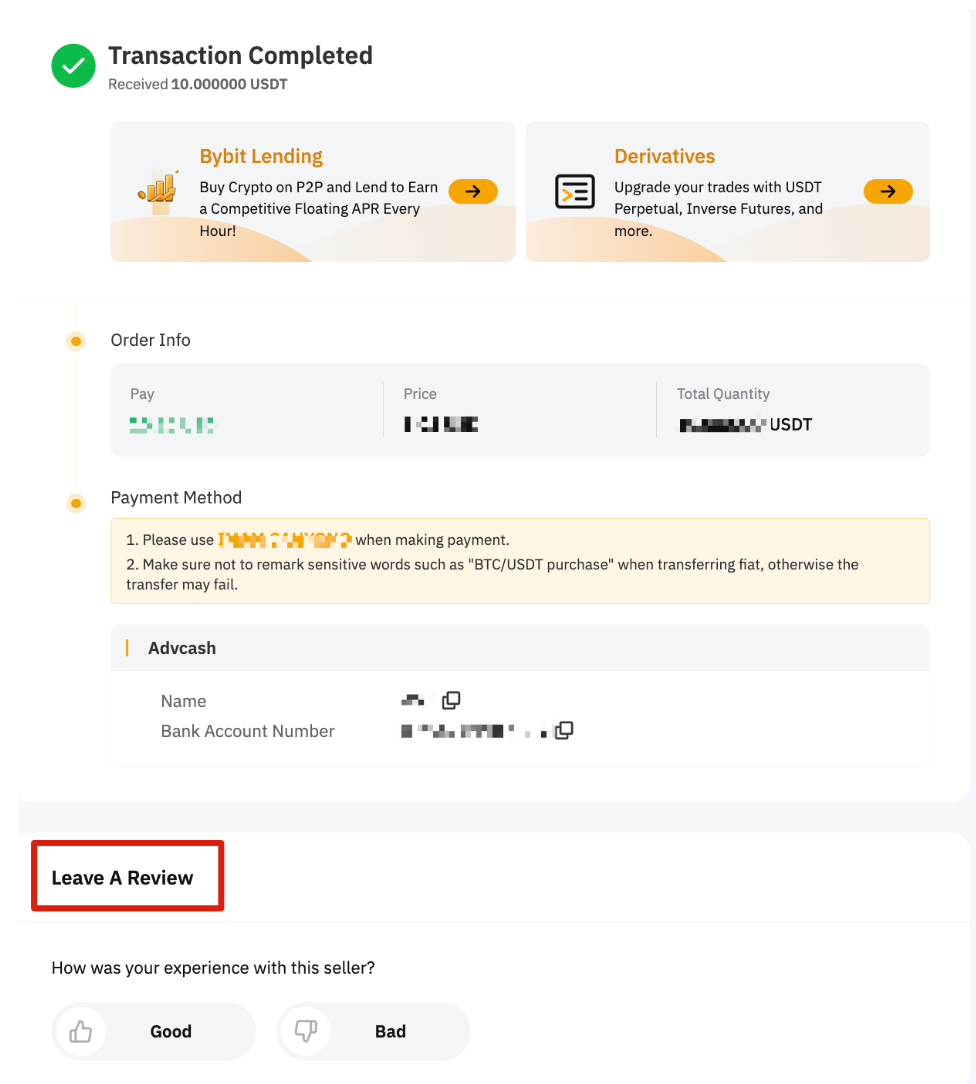 Paso 2: Además de valorar su experiencia comercial, la función de valoración de Bybit P2P también le permite dejar valoraciones de su contraparte comercial.