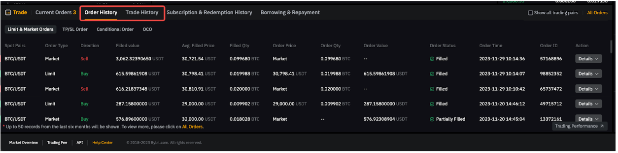 Puedes cambiar a la pestaña Historial de órdenes o Historial de trading en la página de Spot trading para ver hasta 50 registros de los últimos seis (6) meses. De forma similar a las órdenes actuales, puedes marcar la casilla Mostrar todos los pares de trading para ver el historial de órdenes o el historial de trading de todos los pares de trading.