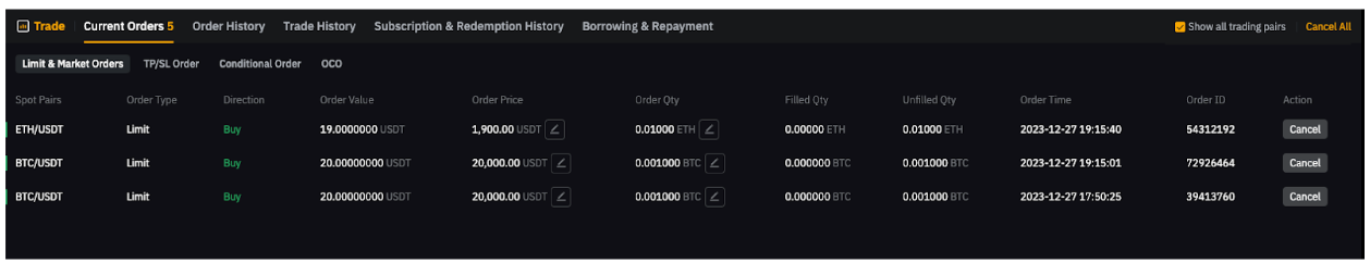 Para cancelar órdenes Spot, ve a la pestaña Órdenes actuales y haz clic en Cancelar. También puedes optar por cancelar todas las órdenes desde la esquina superior derecha. Es importante tener en cuenta que, si has seleccionado la opción Mostrar todos los pares de trading, al tocar Cancelar todas se cancelarán las órdenes de todos los pares de trading.