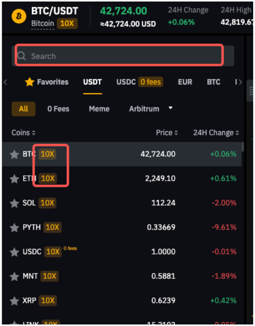 Para encontrar rápidamente el par de trading deseado, utiliza el cuadro de búsqueda para introducir directamente el par que quieres ver. Si ves la etiqueta 10x junto a un par de trading determinado, indica que el par está admitido en el Spot trading con margen.