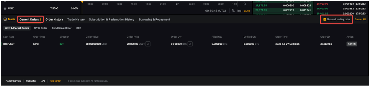 Puedes ver tus órdenes actuales sin ejecutar o sin activar en la pestaña Órdenes actuales. Para mostrar todas las órdenes actuales en todos los pares de trading, marca la casilla en Mostrar todos los pares de trading.