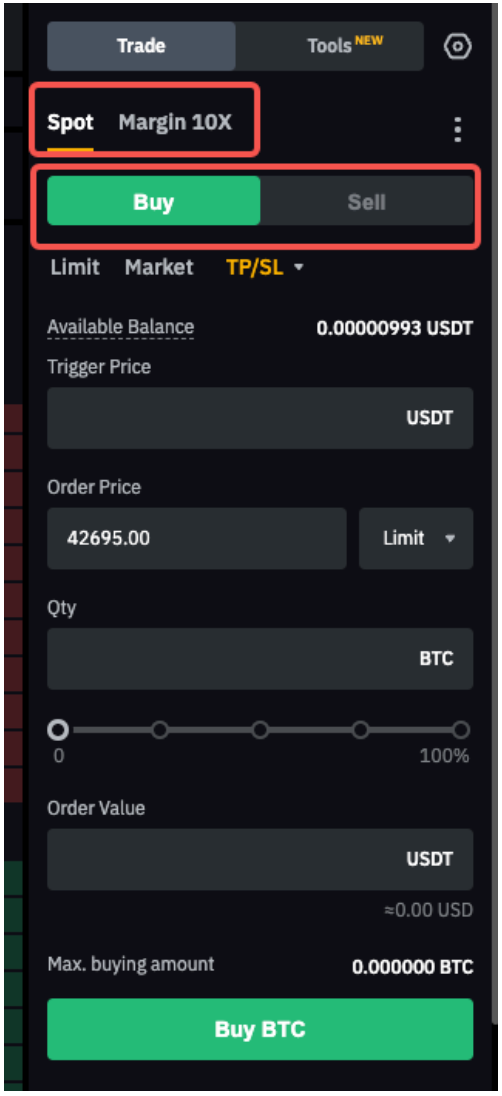 Paso 1: para las operaciones de Spot trading, asegúrate de estar en la pestaña Spot. A continuación, elige Comprar o Vender un activo.