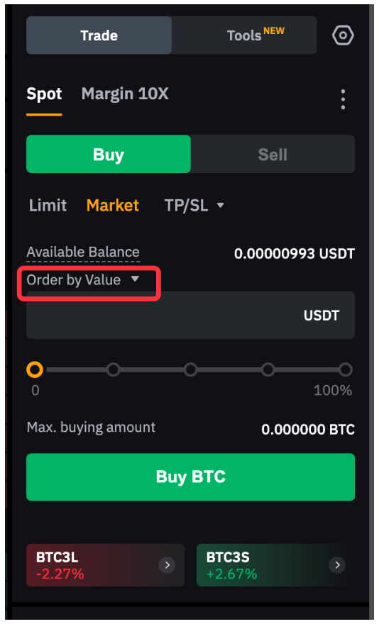 Para las órdenes de compra o venta de mercado, el incumplimiento es hacer una orden por valor (compra de mercado) y por cantidad (venta de mercado).Haz clic en Orden por valor u Orden por cantidad para cambiar tus preferencias de orden.
