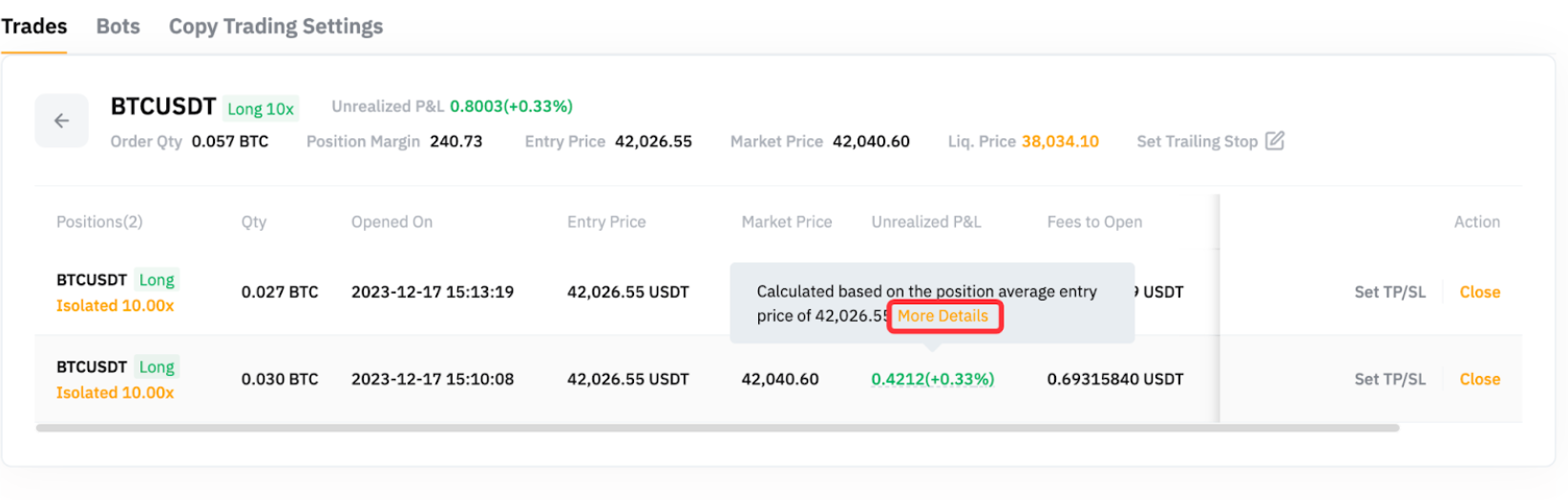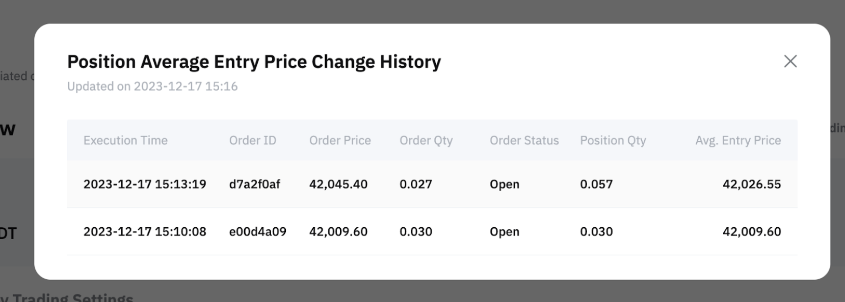 Tenga en cuenta que el precio de entrada que aparece en los detalles de la posición es el precio promedio de entrada de la posición. Para comprobar cómo se obtiene el precio de entrada de la posición, puede desplazar el cursor a Ganancias y Pérdidas no realizadas y hacer clic en Más detalles para ver el Historial de cambios del precio promedio de entrada de la posición.