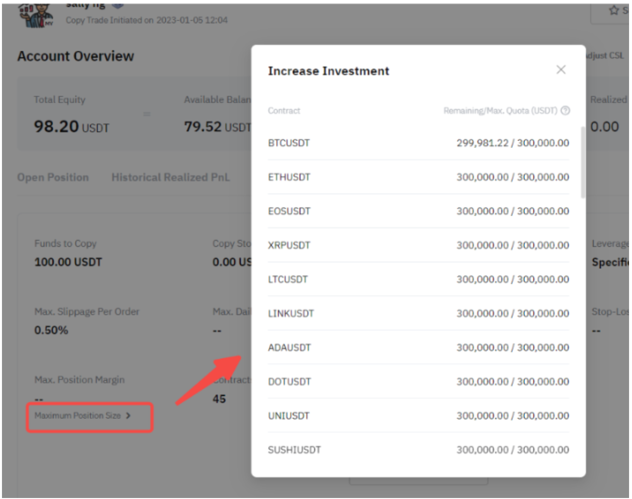 El tamaño máximo de la posición muestra el valor restante y máximo de la orden que se puede seguir para tus copy trades derivado de los tamaños de tus posiciones en dirección tanto larga como corta.