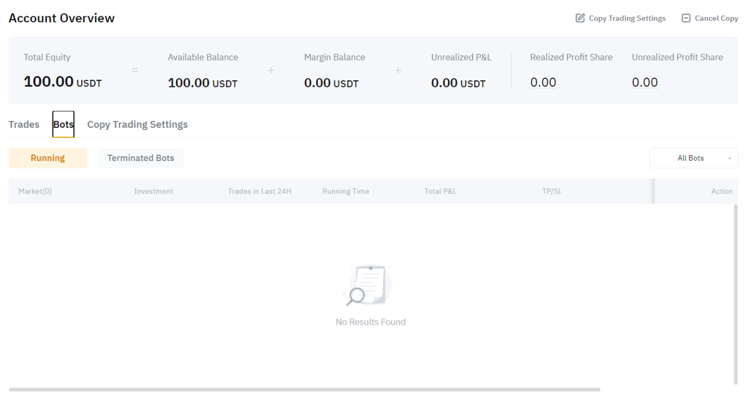Tenga en cuenta que después de cancelar la copia del Master Trader, sus bots serán dados de baja, todas las posiciones abiertas serán cerradas, y el saldo restante será reembolsado a su Cuenta de Fondos.