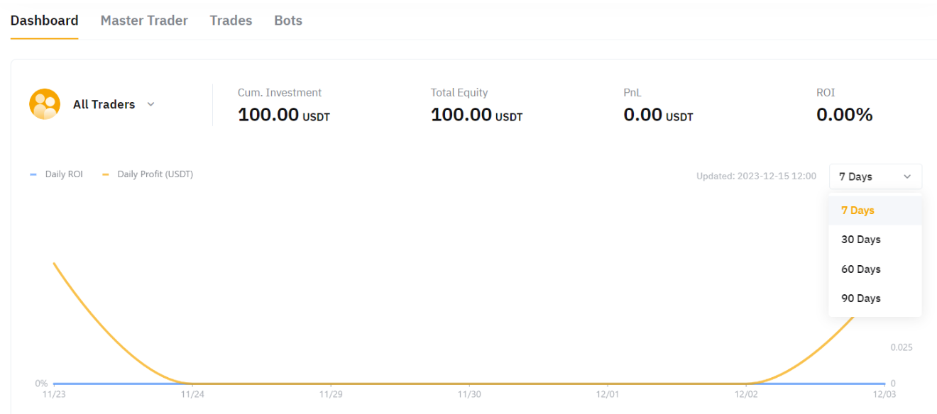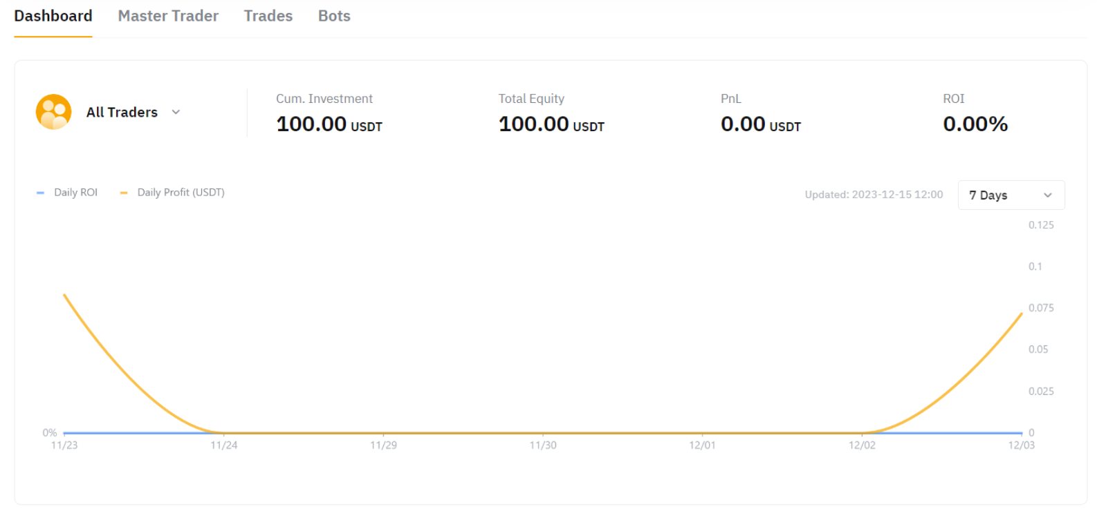 Puedes ver los resultados del ROI y las PyG actuales de todos los Master Traders que sigues, o filtrar cada Master Trader para ver los resultados de forma individual.