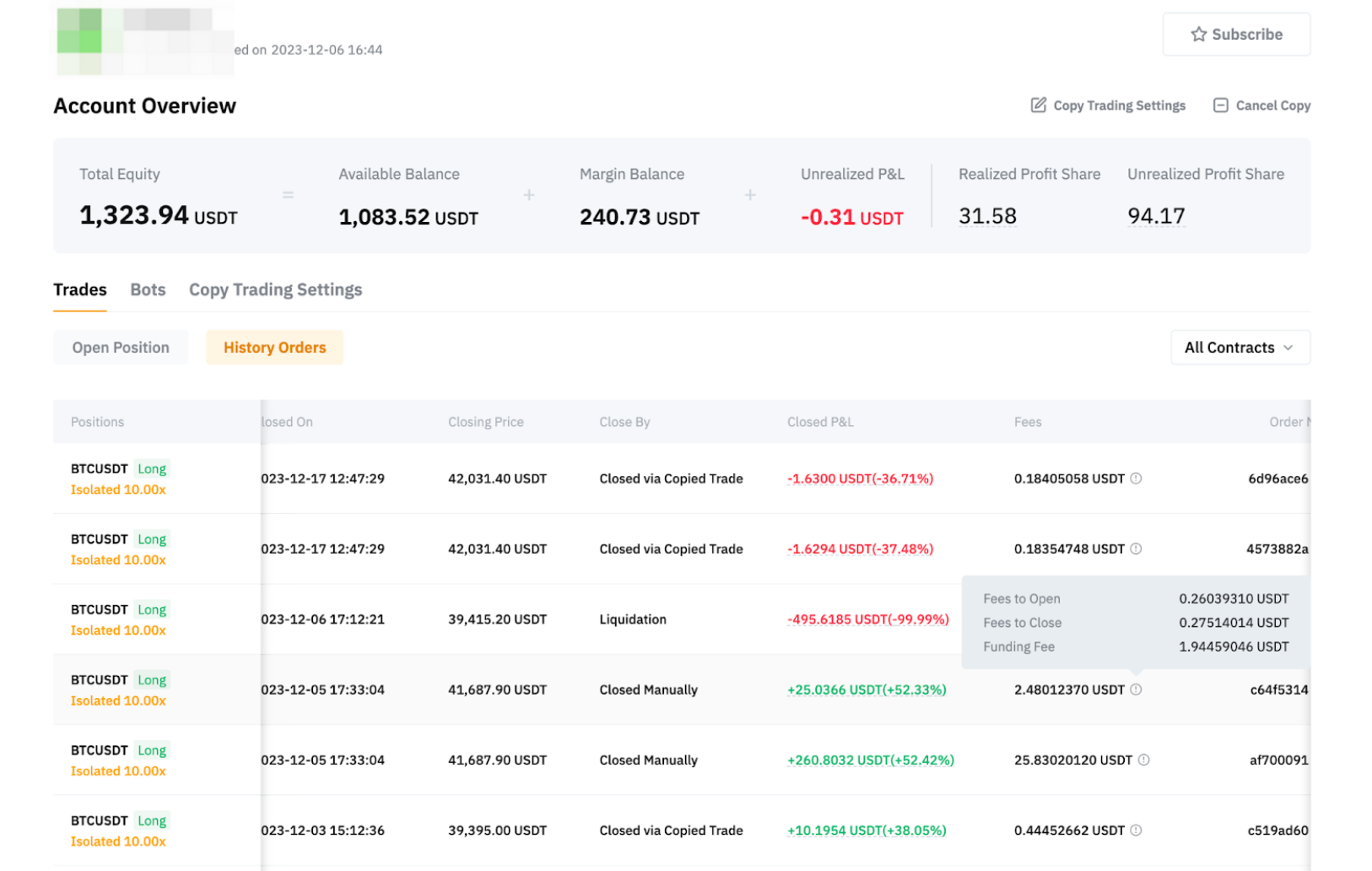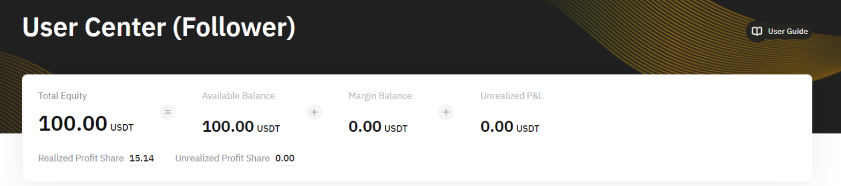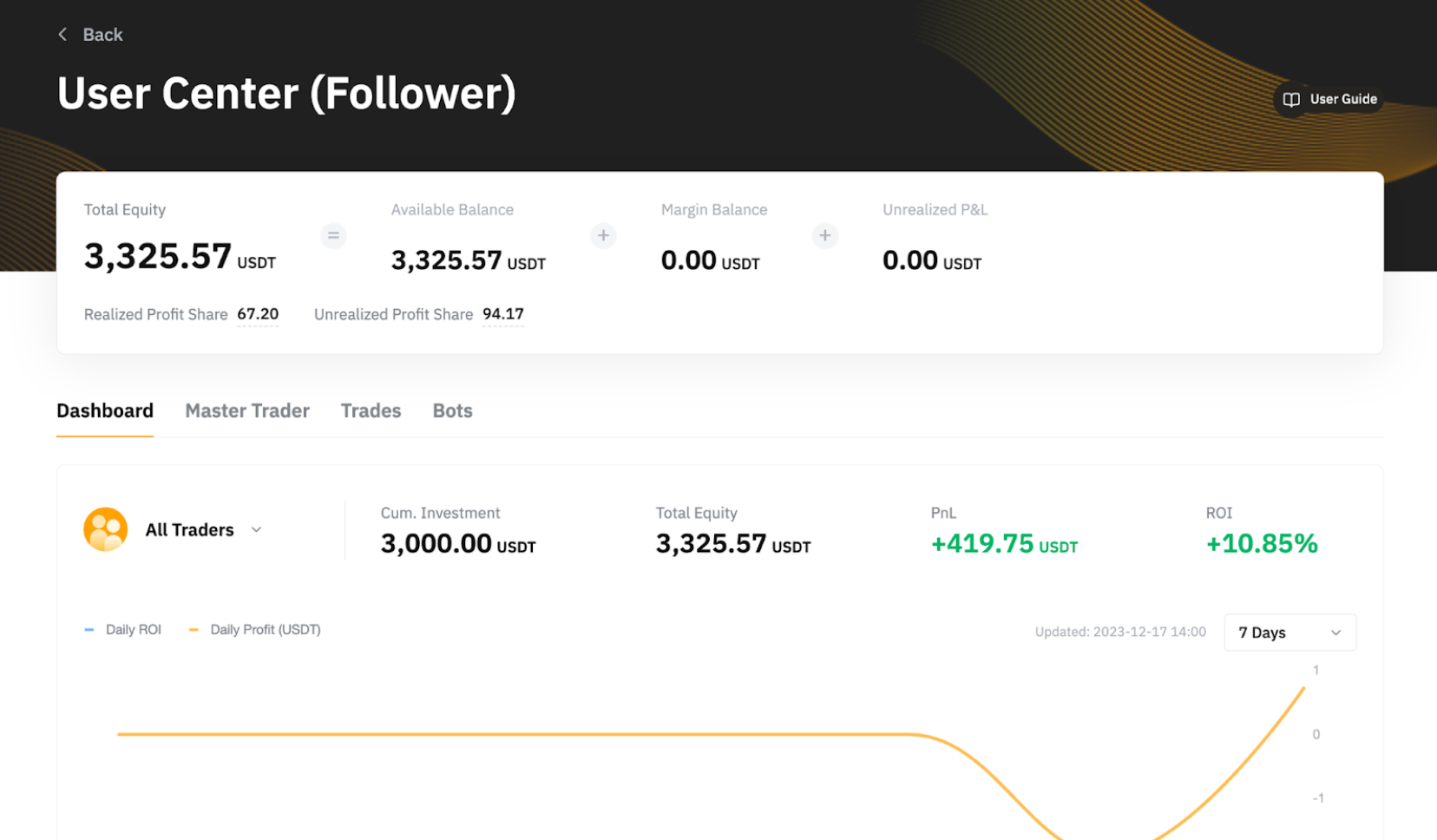 Desde el Centro de usuario (seguidor) de copy trading, los usuarios pueden consultar un resumen de sus cuentas de copy trading, el rendimiento anterior o actual de los Master Traders que siguen y los detalles de las órdenes.