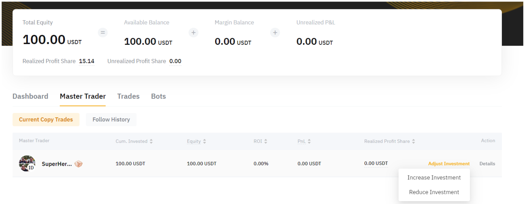 Puedes ver los Copy Trades actuales y el Historial de Seguidor de cada Master Trader. También puedes hacer clic en Ajustar inversión para aumentar o reducir los fondos para copiar al correspondiente Master Trader. Tenga en cuenta que el importe reducido se transferirá automáticamente a su cuenta de financiación.