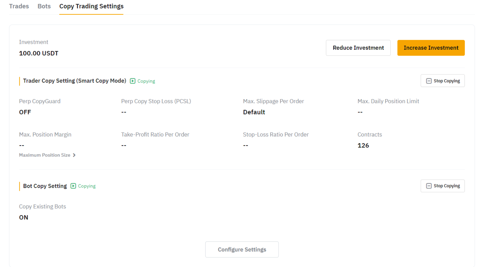 Desde esta página puedes ver y editar la configuración de los parámetros de copy trading que has ajustado para el correspondiente Master Trader.