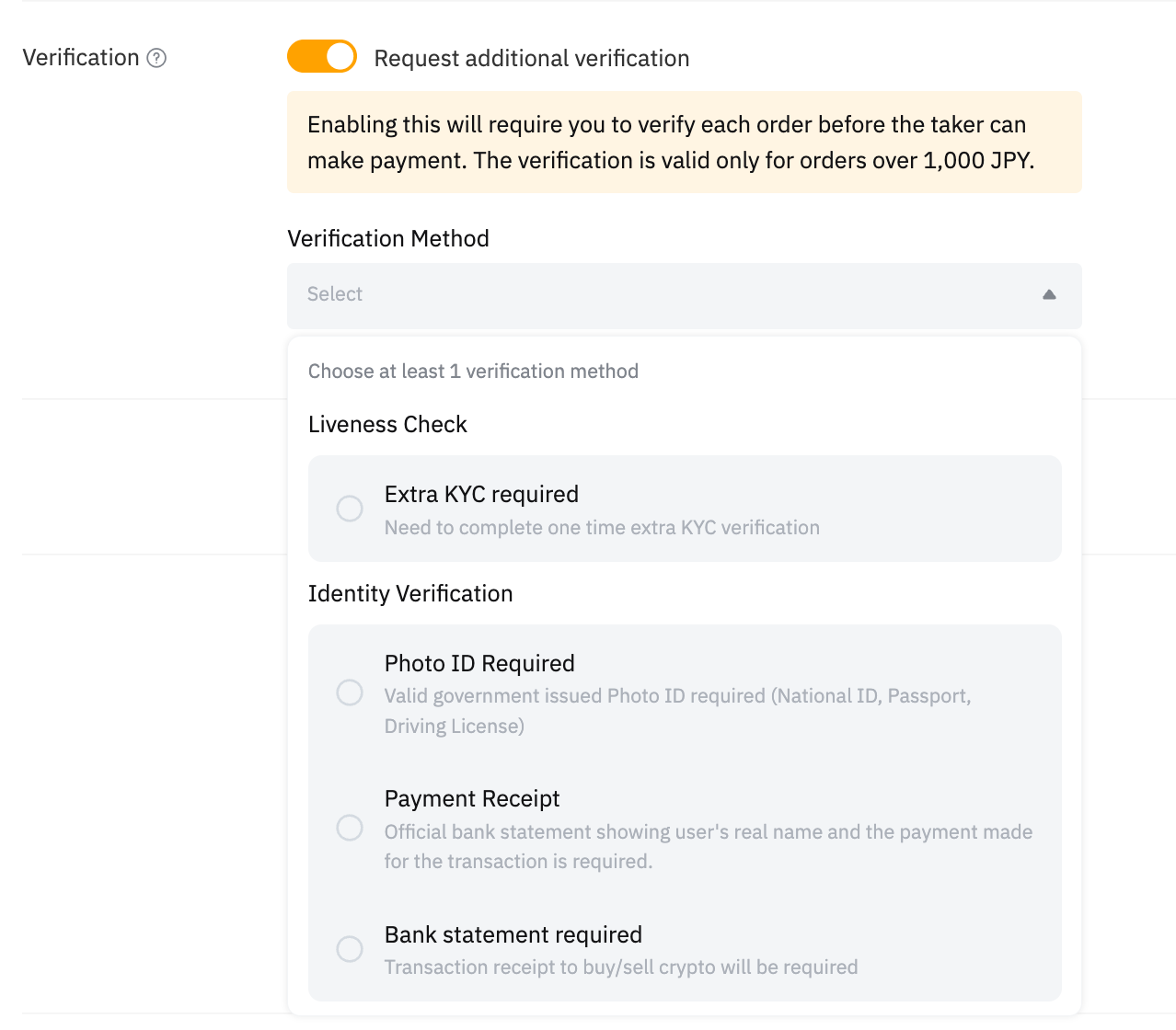 Cuando el Anunciante Verificado (VA) y el Anunciante en Bloque (BA) habilitan el Requisito de Verificación, los takers deben completar la verificación con los anunciantes cuando la orden supere el umbral especificado de moneda fiduciaria. Ambas partes tienen derecho a decidir si proceder con la transacción durante el período de verificación dentro del plazo. Los anunciantes pueden solicitar la siguiente prueba al taker en el cuadro de chat de la orden: