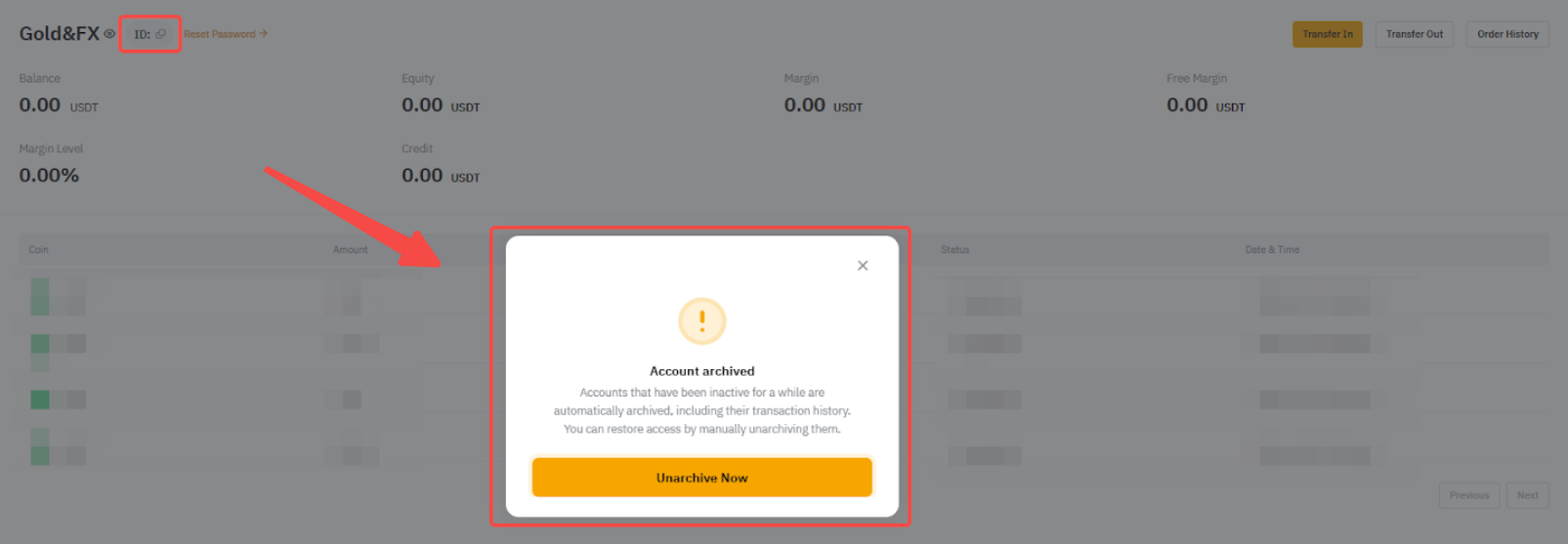 Ve a tu página de activos de Bybit MT5. Aparecerá un mensaje emergente informándote de que tu cuenta está archivada. Para desarchivar la cuenta, haz clic en el botón Desarchivar ahora.