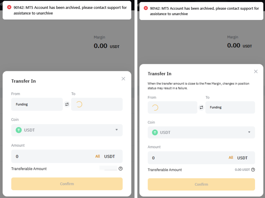 3. Verás un mensaje de error al intentar transferir fondos desde y hacia tu cuenta MT5.